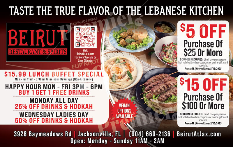 Beirut Restaurant & Spirits delivers a Mediterranean and Lebanese dining experience with a menu featuring mezzes, flatbreads, kebab platters, salads, and specialty dishes. They also operate a full bar, offer hookah services, and host live music and entertainment on select nights. Their weekday lunch buffet is a popular draw, and they cater private events and larger groups.