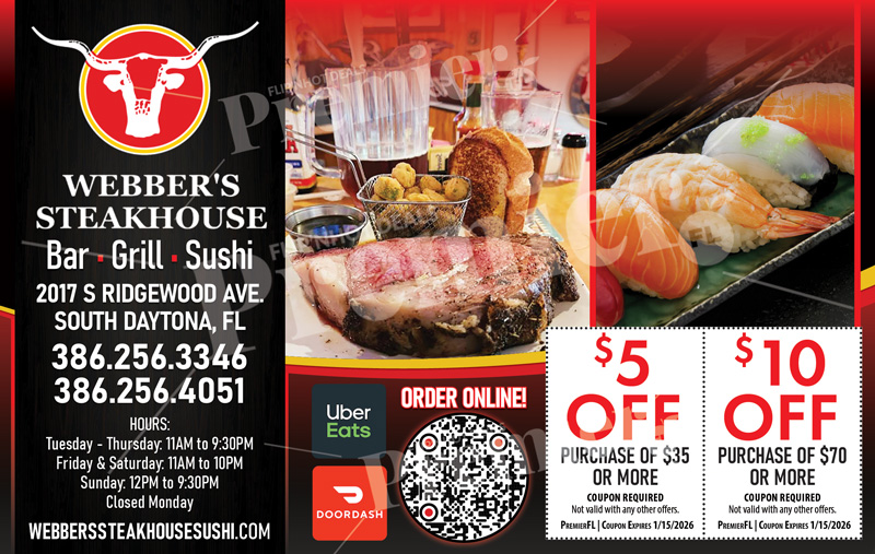Located on Ridgewood Avenue in South Daytona, Webber’s Steakhouse & Sushi offers dine-in service along with convenient online ordering, Uber Eats, and DoorDash options. With friendly service and a versatile menu, it’s a go-to spot for locals searching for “steakhouse near me” or sushi paired with a relaxed, upscale dining experience.
